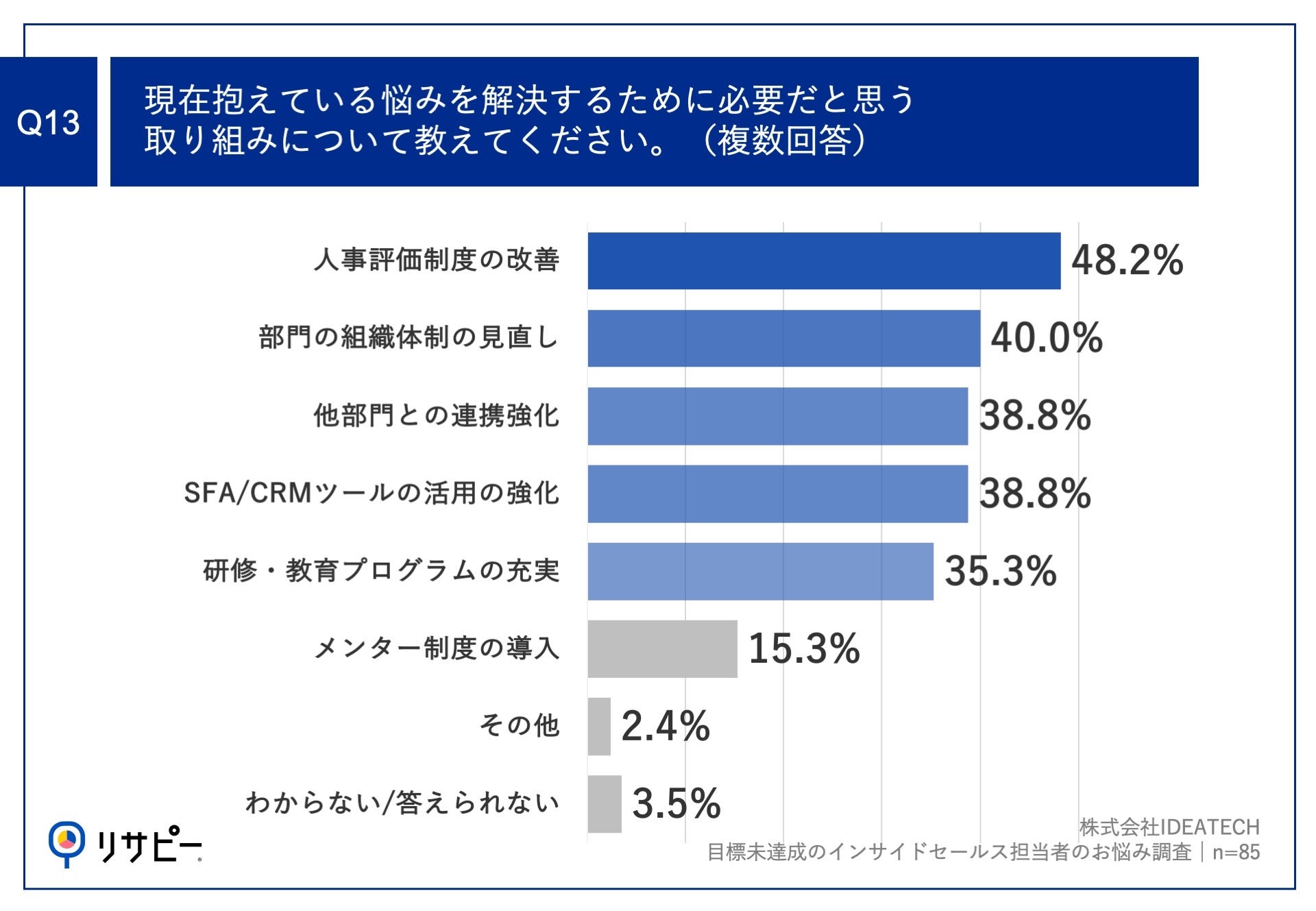 Q10で「特にない」「わからない/答えられない」以外を回答した方に、「Q13.現在抱えている悩みを解決するために必要だと思う取り組みについて教えてください。(複数回答)」(n=85)と質問したところ、「人事評価制度の改善」が48.2%、「部門の組織体制の見直し」が40.0%という回答となりました。