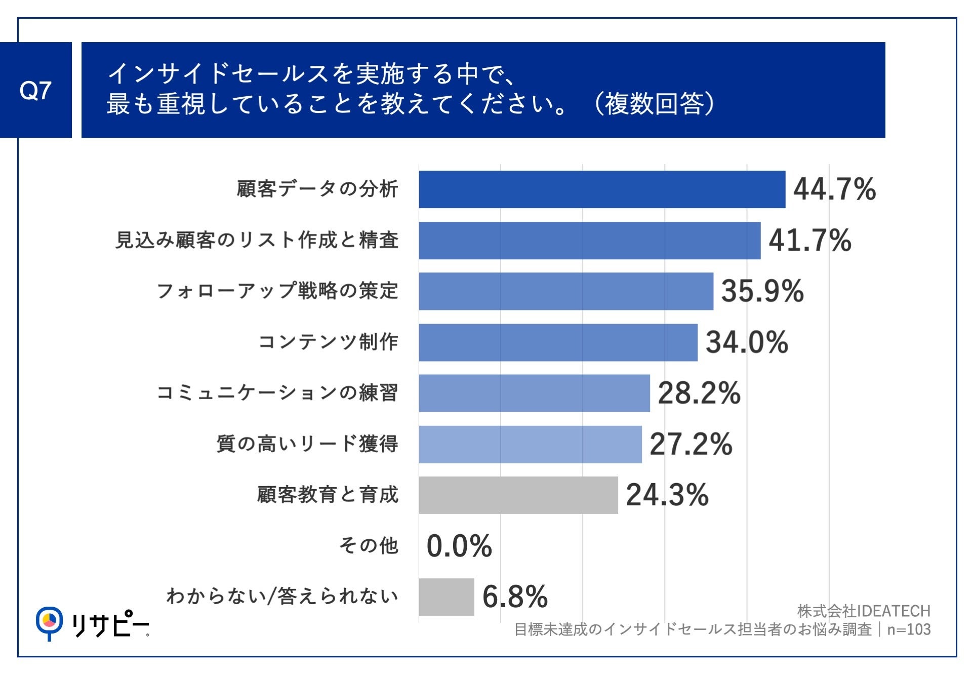「Q7.インサイドセールスを実施する中で、最も重視していることを教えてください。(複数回答)」(n=103)と質問したところ、「顧客データの分析」が44.7%、「見込み顧客のリスト作成と精査」が41.7%、「フォローアップ戦略の策定」が35.9%という回答となりました。