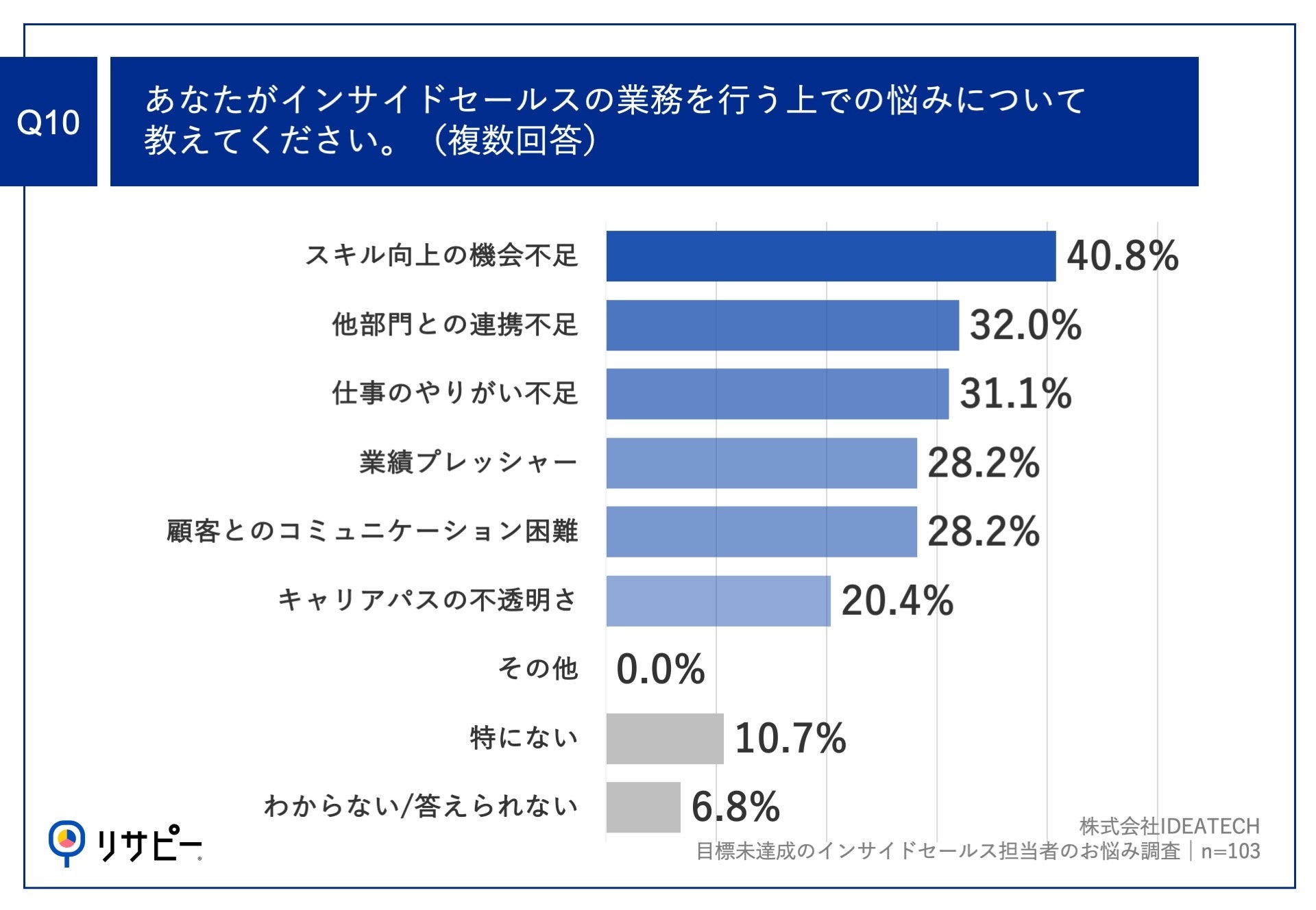 「Q10.あなたがインサイドセールスの業務を行う上での悩みについて教えてください。(複数回答)」(n=103)と質問したところ、「スキル向上の機会不足」が40.8%、「他部門との連携不足」が32.