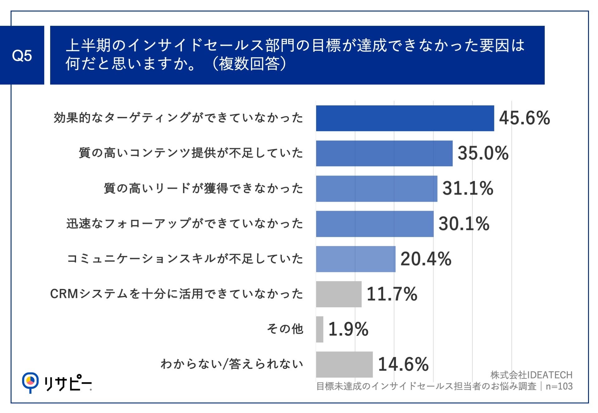 「Q5.上半期のインサイドセールス部門の目標が達成できなかった要因は何だと思いますか。(複数回答)」(n=103)と質問したところ、「効果的なターゲティングができていなかった」が45.6%、「質の高いコンテンツ提供が不足していた」が35.0%、「質の高いリードが獲得できなかった」が31.1%という回答となりました。