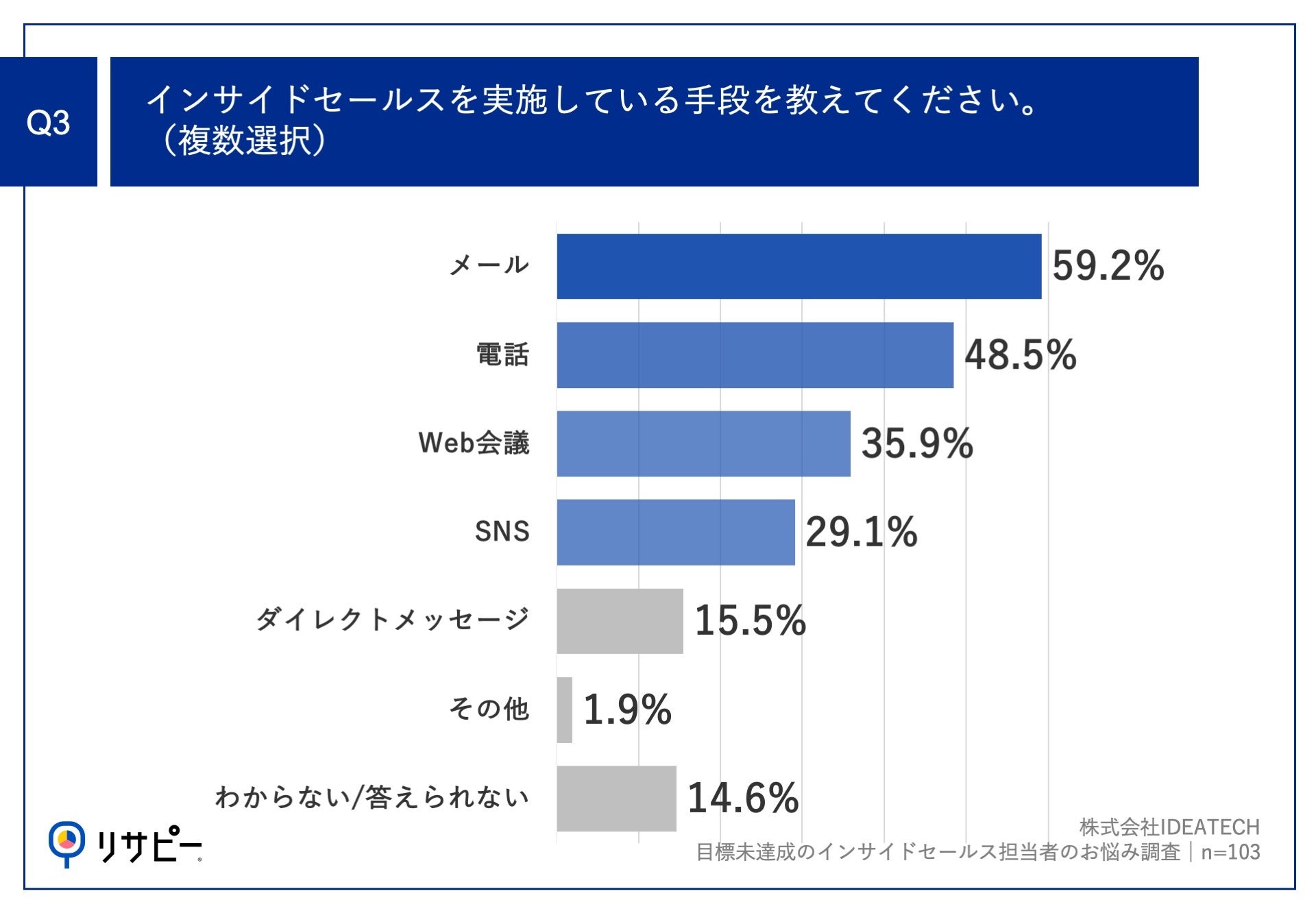 「Q3.インサイドセールスを実施している手段を教えてください。(複数選択)」(n=103)と質問したところ、「メール」が59.2%、「電話」が48.5%、「Web会議」が35.9%という回答となりました。