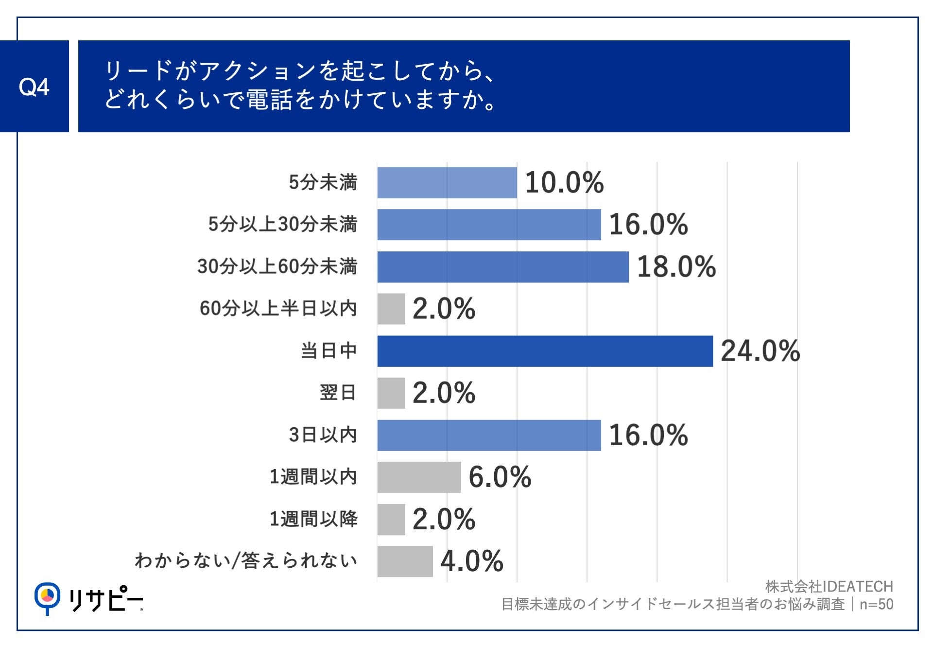 Q3で「電話」と回答した方に、「Q4.リードがアクションを起こしてから、どれくらいで電話をかけていますか。」(n=50)と質問したところ、「当日中」が24.0%、「30分以上60分未満」が18.0%、「5