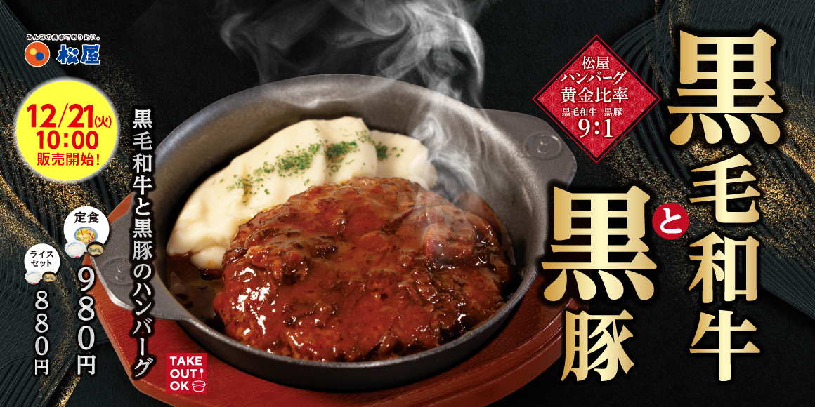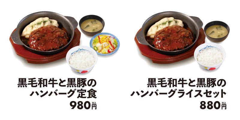 このたび松屋フーズ(本社:東京都武蔵野市、代表取締役社長:瓦葺一利)では、牛めし・カレー・定食・その他丼の「松屋」におきまして、2021年12月21日(火)より、「黒毛和牛と黒豚のハンバーグ定食」「黒毛和牛と黒豚のハンバーグライスセット」を販売いたします。