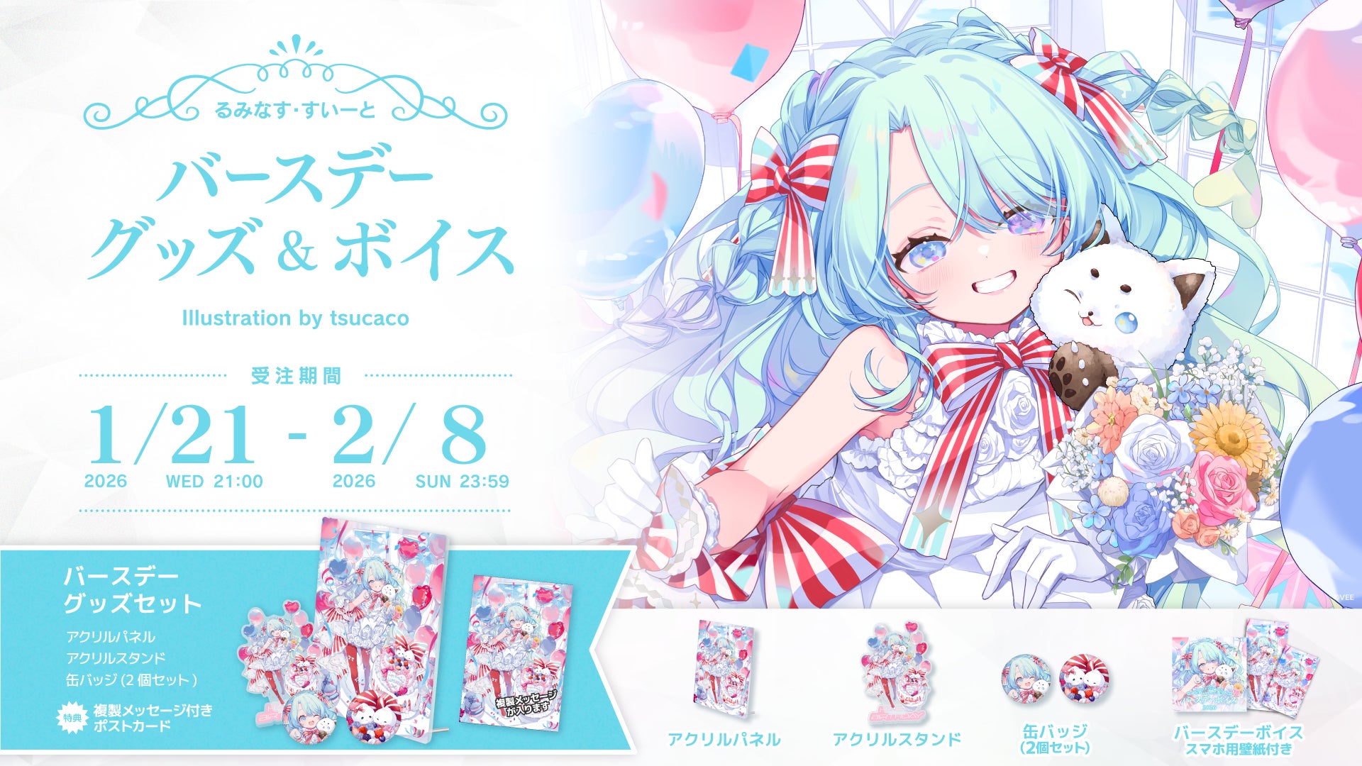 本日・1月21日に誕生日を迎えたるみなす・すいーとのバースデーグッズの詳細を公開するとともに、公式オンラインショップ「VEE Official Shop」にて受注販売を開始しました。