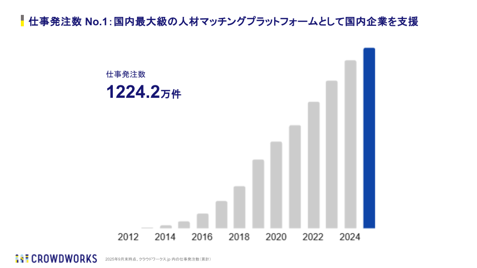 当社が運営する「クラウドワークス.jp」は、当社ミッションである「個のためのインフラになる」のもと、誰もが場所や時間にとらわれずに匿名で仕事を受発注できる、国内最大級の人材マッチングプラットフォームです。2012年から現在に至るまでフリーランス・副業・在宅ワークなど、従来の雇用形態にとらわれない働き方を提供し、企業の業務プロセスや個人の稼ぎ方に革新をもたらしています。その結果、クラウドワークス.jpで累計1,224.2万件以上の仕事発注がプラットフォーム内で発生し、第三者調査機関の比較調査においてクラウドワークス.jpが「仕事発注数 No.1」を獲得しました。