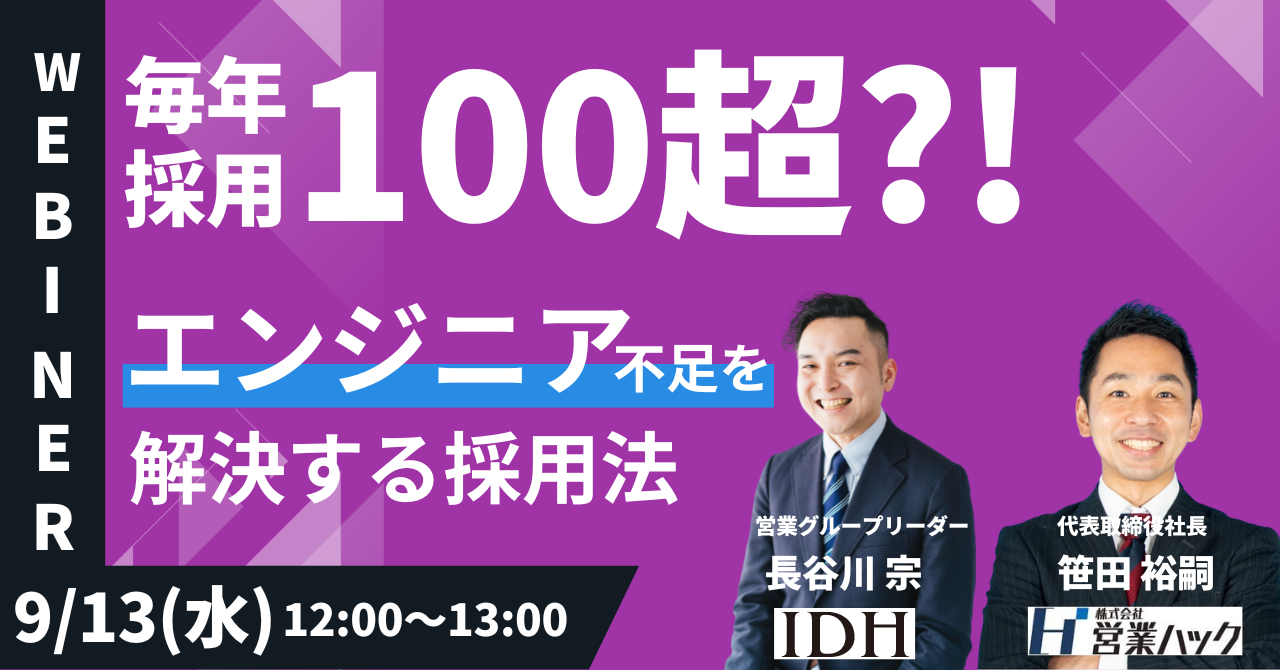 【IT・エンジニアリング企業必見】毎年100名エンジニア採用のノウハウから高スキル人材採用のコツをお伝えします《9/13(水)12:00~無料オンラインセミナー》