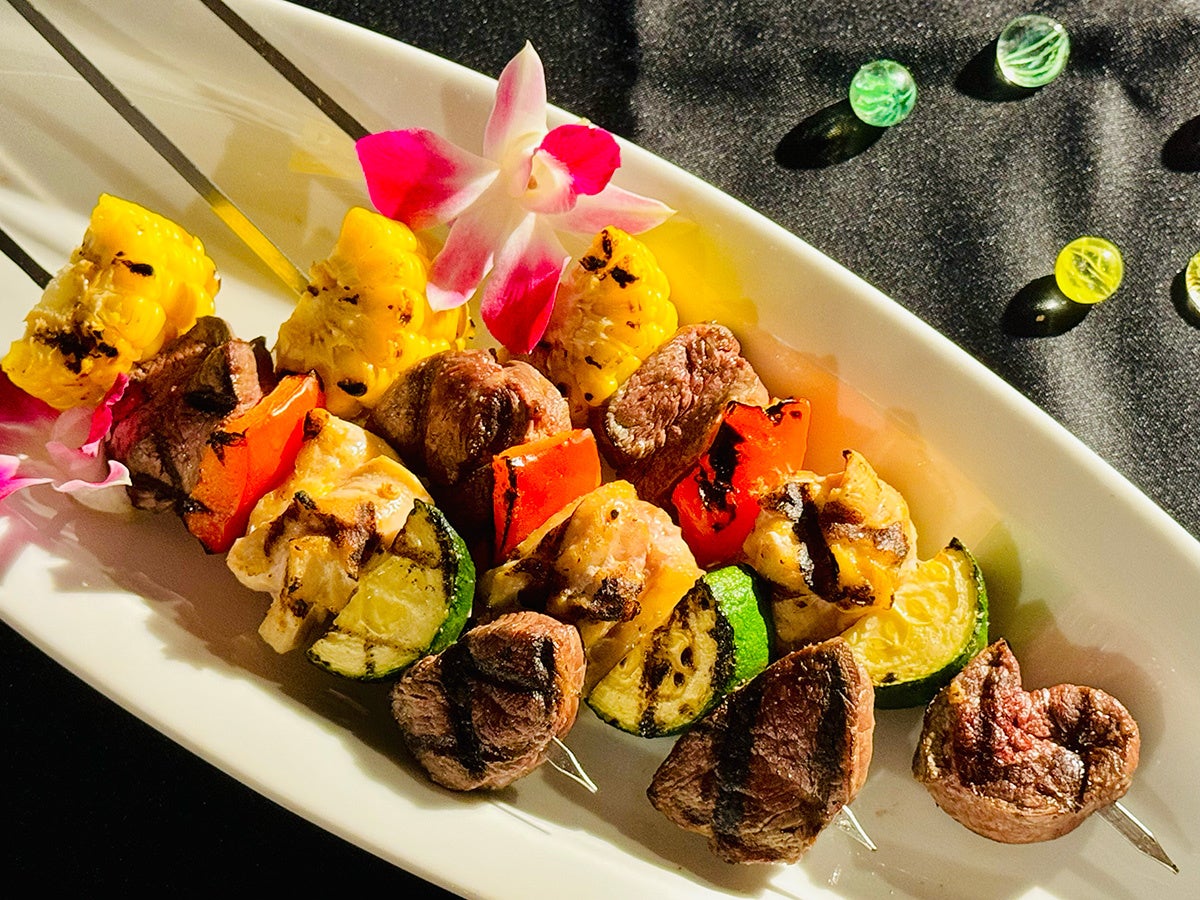 (焼き鳥をイメージした)牛ヒレと鶏モモ肉のブロシェット ネギ塩添え