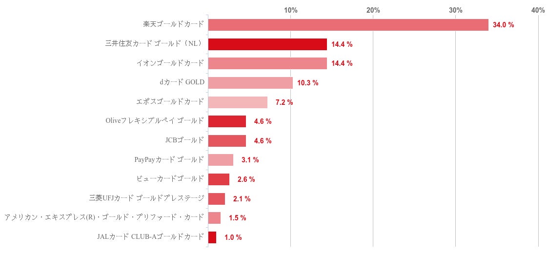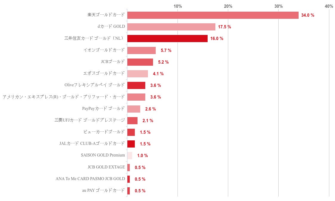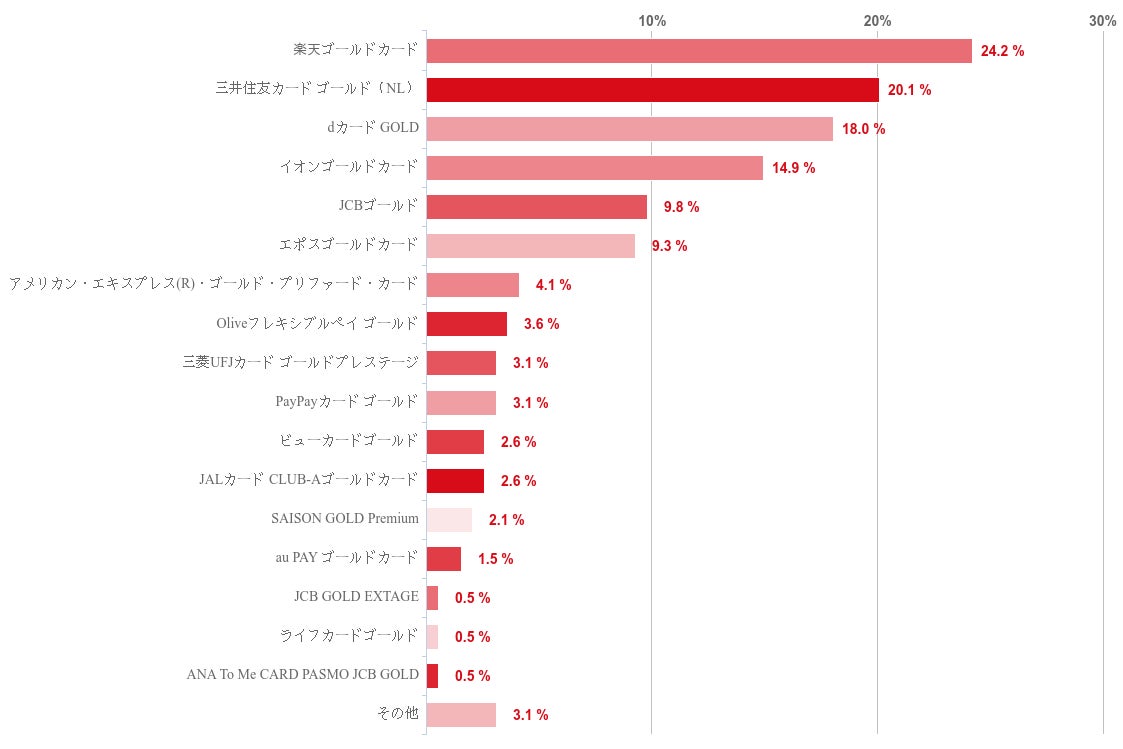 楽天ゴールドカードが24.2%で最も多く、三井住友カードゴールド(NL)が20.1%でこれに続いた。また、dカードGOLDが18%で票を集めた他、イオンゴールドカードやJCBゴールドにも一定数の回答があった。