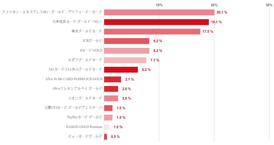アメリカン・エキスプレス(R)・ゴールド・プリファード・カードが20.1%で最も多く、三井住友カードゴールド(NL)が19.1%でこれに続いた。また、楽天ゴールドカード(17.5%)やJCBゴールド、dカードGOLD(8.2%)などにも票が集まった。