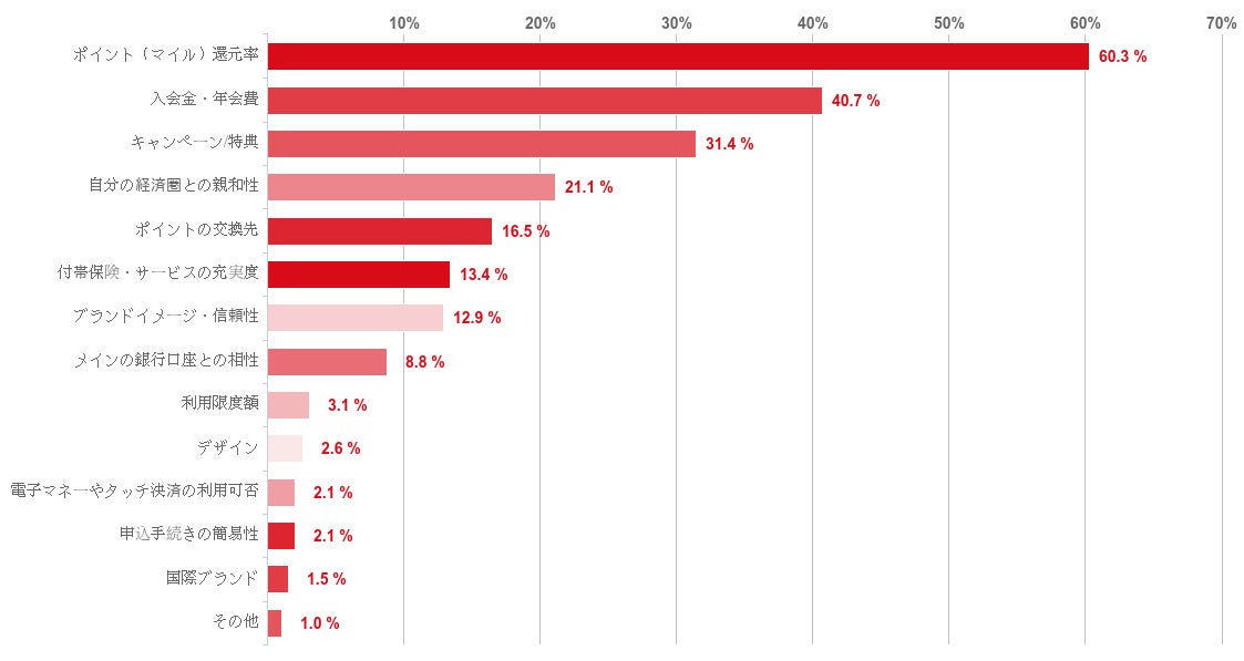 「ポイント(マイル)還元率」が60.3%と過半数を超えて最も多く、「入会金・年会費」が40.7%で次に多かった。その他には「キャンペーン・特典」を選ぶ人も多かった。