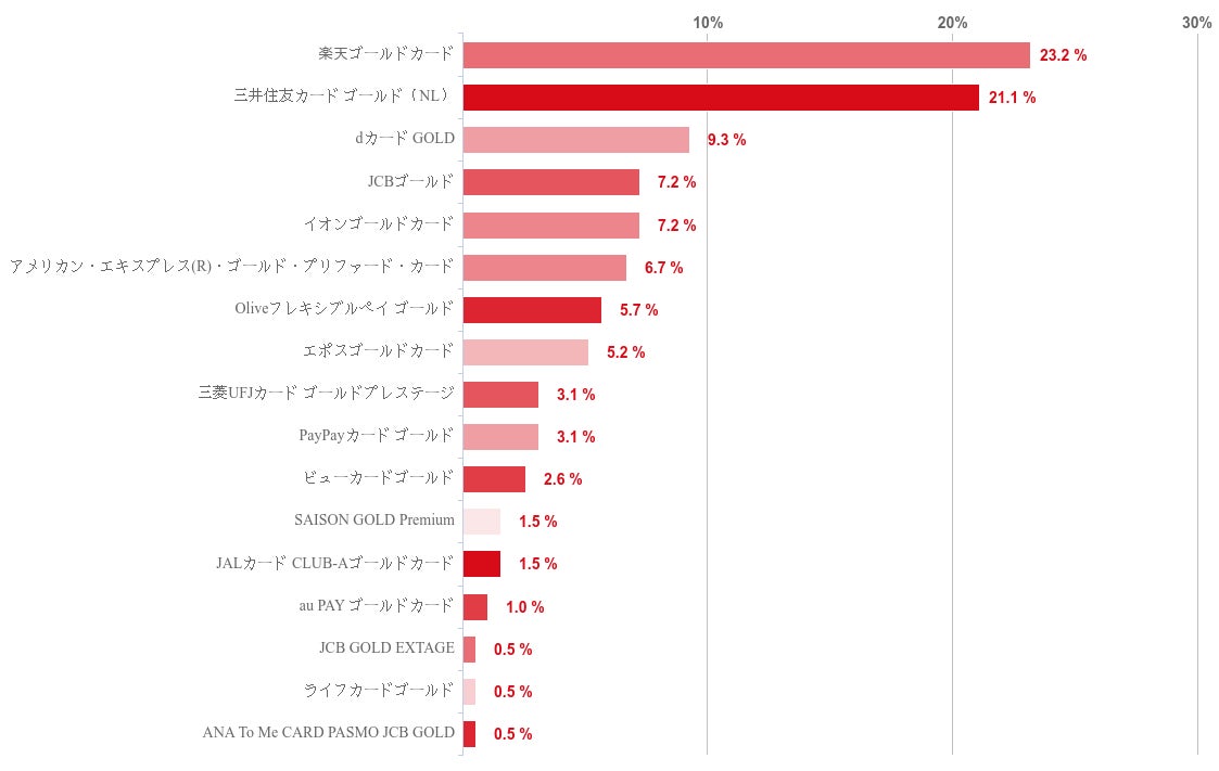 楽天ゴールドカードが23.2%で最も多く、三井住友カードゴールド(NL)が21.1%でこれに続いた。また、dカードGOLDやJCBゴールド、イオンゴールドカード等にも一定数の回答があった。