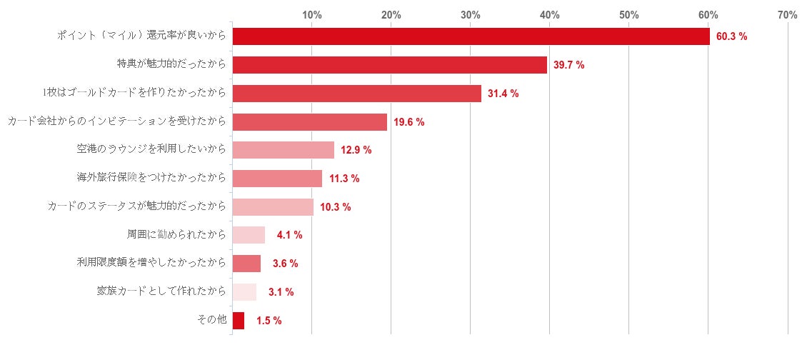 「ポイント(マイル)還元率が良いから」が60.3%で最も多く、これに「特典が魅力的だったから」が39.7%で続いた。また、「1枚はゴールドカードを作りたかったから」という人も31.4%いた。