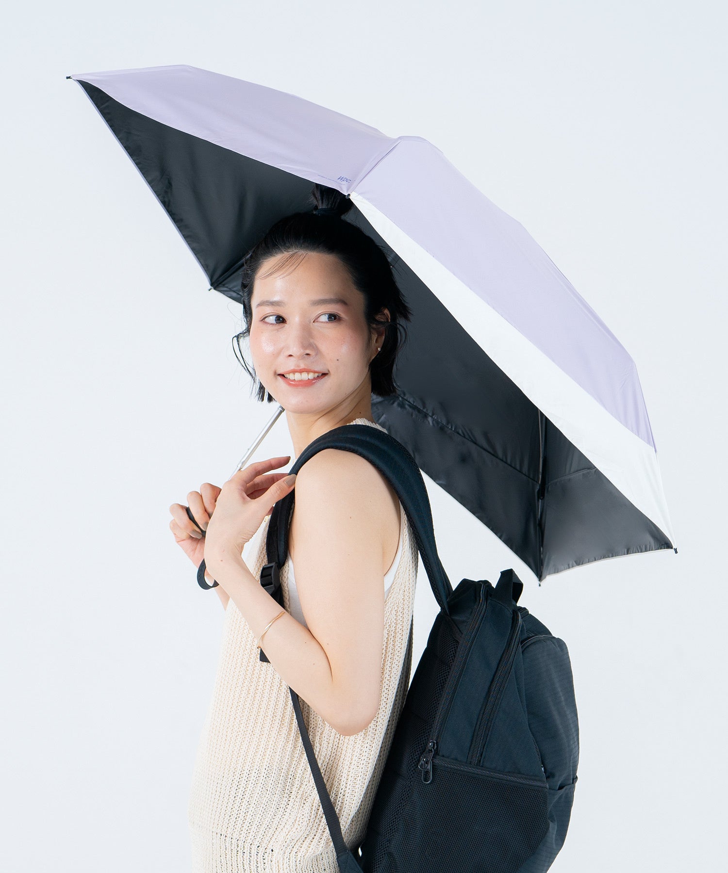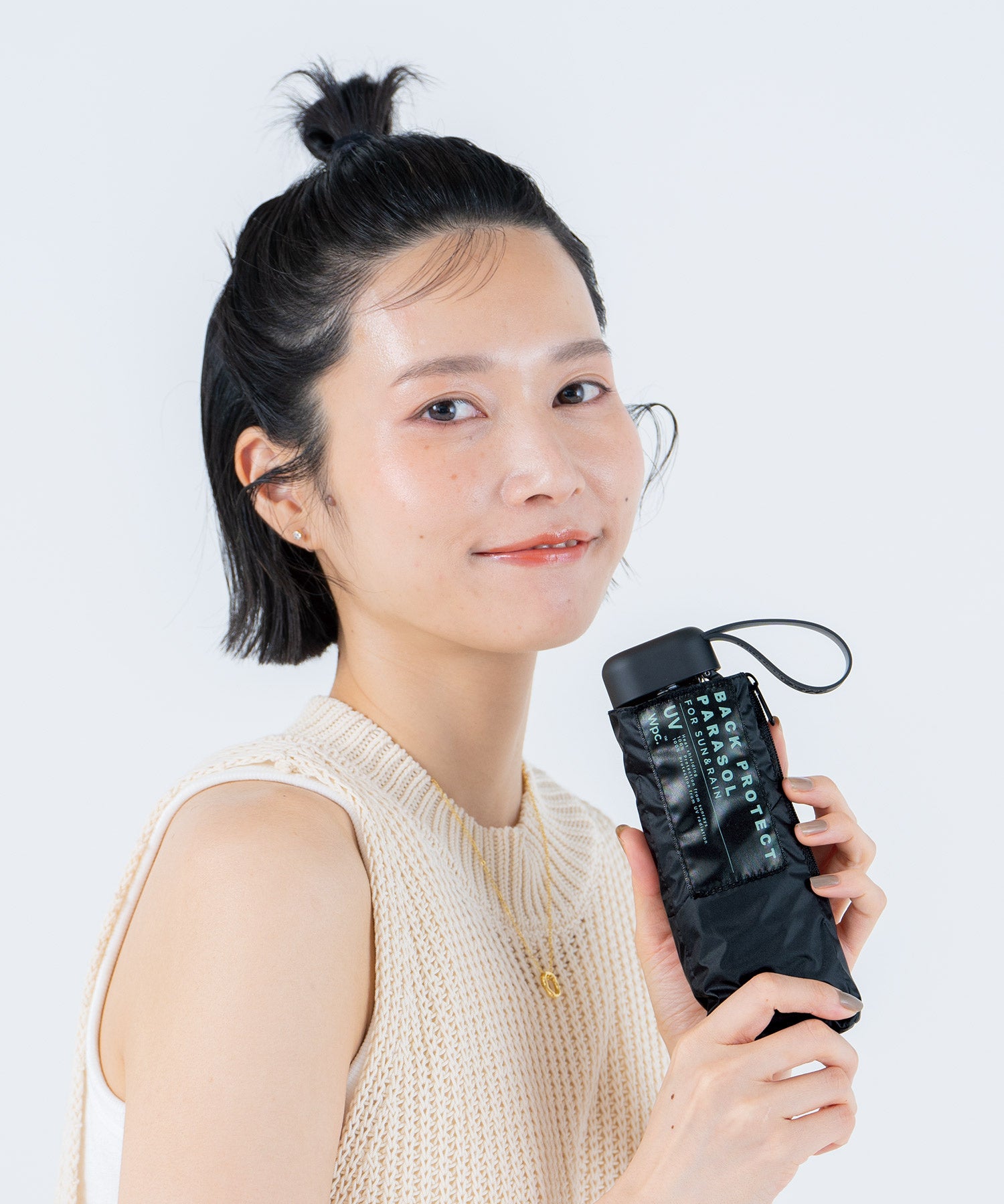 「遮光バックプロテクトパラソルタイニー」は傘を開くと骨の一部が約10cm拡張する特殊構造で、強い日差しから首元をしっかりガードしてくれます。晴雨兼用傘として使えるので、雨の日はバックパックも守ってくれる頼もしい1本。折りたためば縦18cm×横8cmのコンパクトサイズなので、常にバッグに入れておきたい傘です。