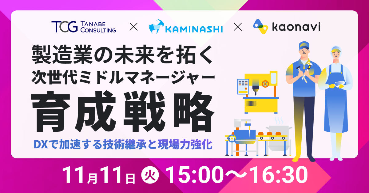 日本の経営コンサルティングのパイオニアである株式会社タナベコンサルティング(本社:東京都千代田区・大阪市淀川区、代表取締役社長:若松 孝彦)は、株式会社カミナシ、株式会社カオナビと共に、2025年11月11日(火)15:00~16:30に、無料ウェビナー「製造業の未来を拓く、次世代ミドルマネージャー育成戦略〜DXで加速する技術継承と現場力強化〜」を開催いたします。