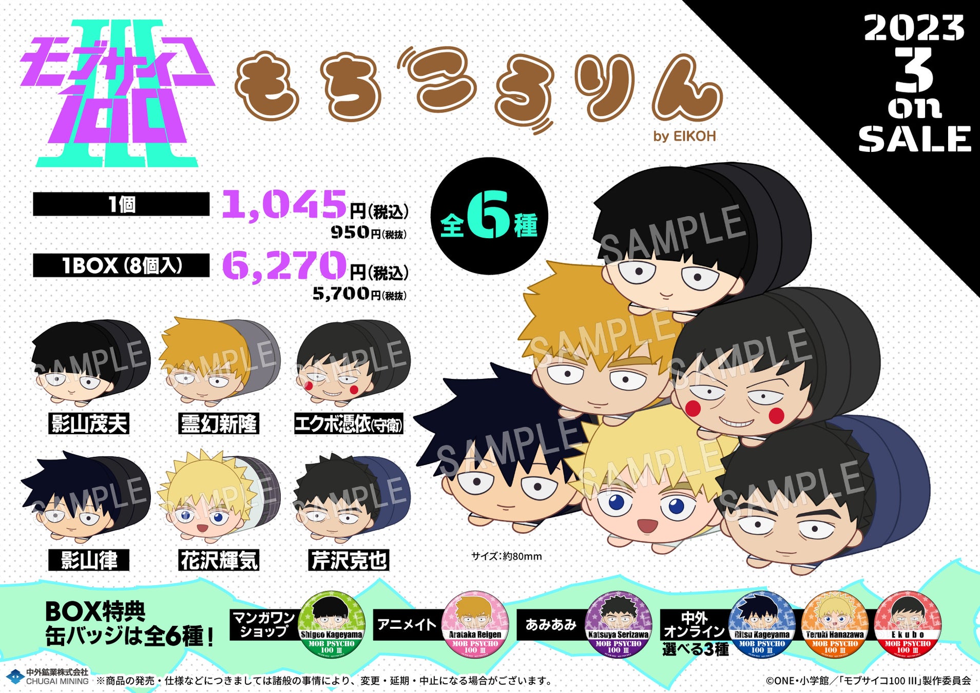 TVアニメ『モブサイコ100 Ⅲ』より、まんまる可愛いぬいぐるみマスコット「もちころりん」が登場!!店舗別BOX特典缶バッジは6種類!