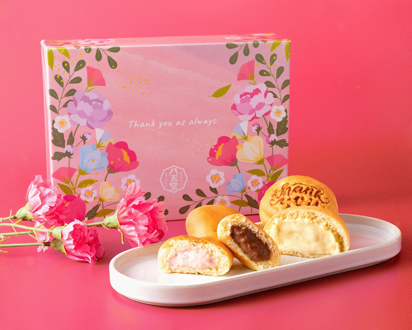 八天堂の代名詞くりーむパンは、日頃の感謝の気持ちが伝わる焼印入り「Thank youくりーむパン」や人気の季節フレーバー「あまおう苺」、「桃」などをラインアップ。