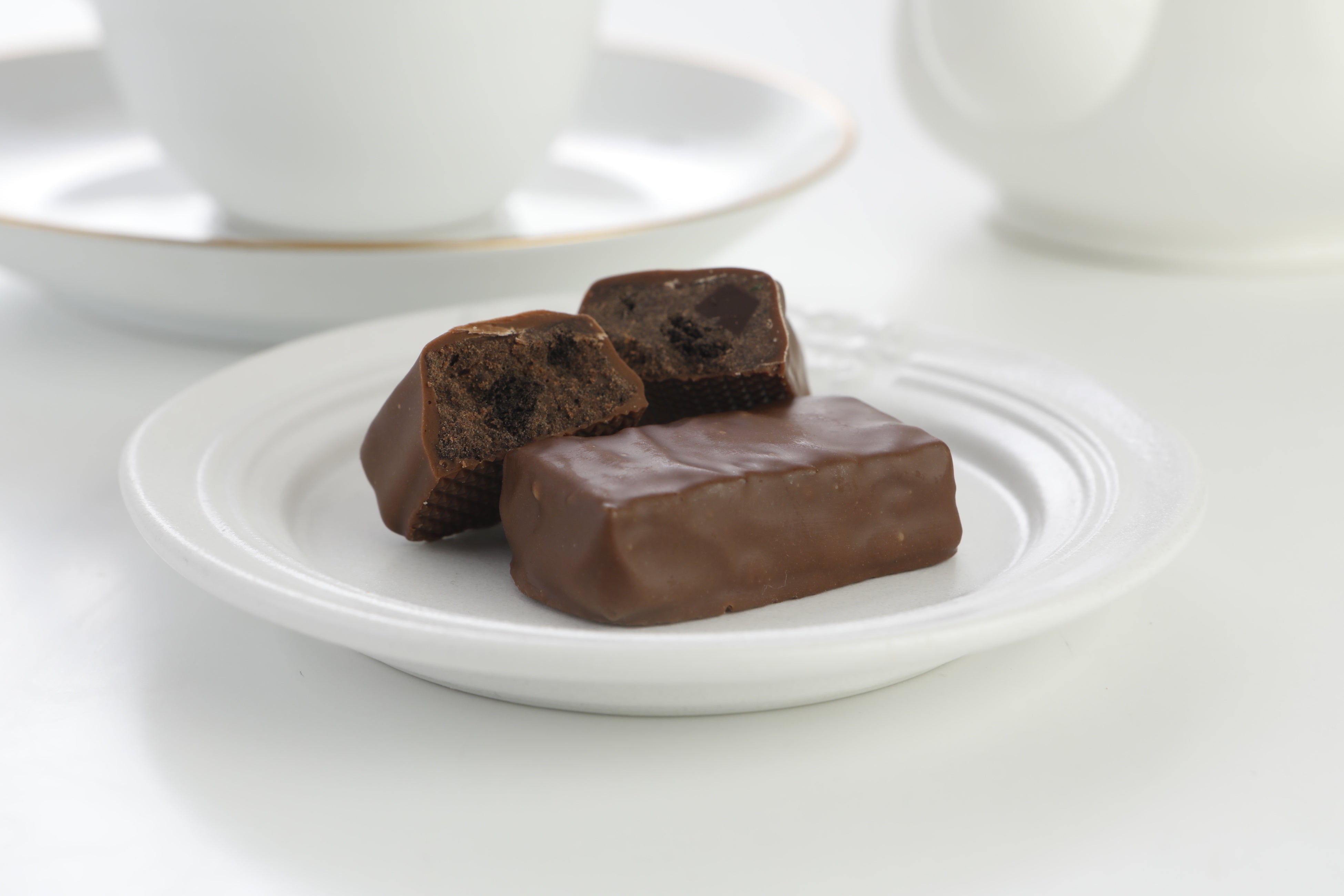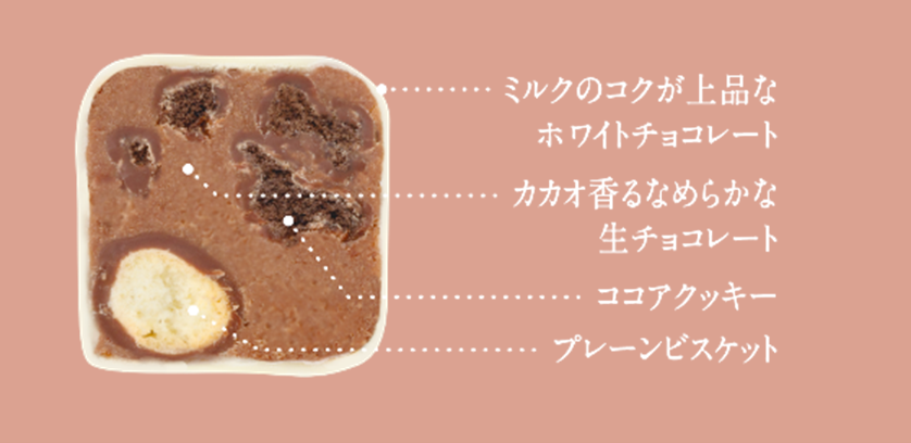 自社製造のチョコレートケーキのしっとりとした食感を、さくっとほろほろとした口どけの良いココアクッキーを配合しました。常温でも柔らかく、なめらかな食感をお楽しみいただけるよう仕上げています。
