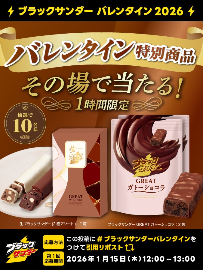有楽製菓株式会社(本社:東京都小平市、代表取締役社長 河合辰信)は、2026年のブラックサンダーバレンタイン企画第1弾としてバレンタイン限定商品の「生ブラックサンダーGREAT SELECTIONS」と「ブラックサンダーGREATガトーショコラ」を、2026年1月15日(木)より有楽製菓公式オンラインショップ、直営店にて発売いたします。