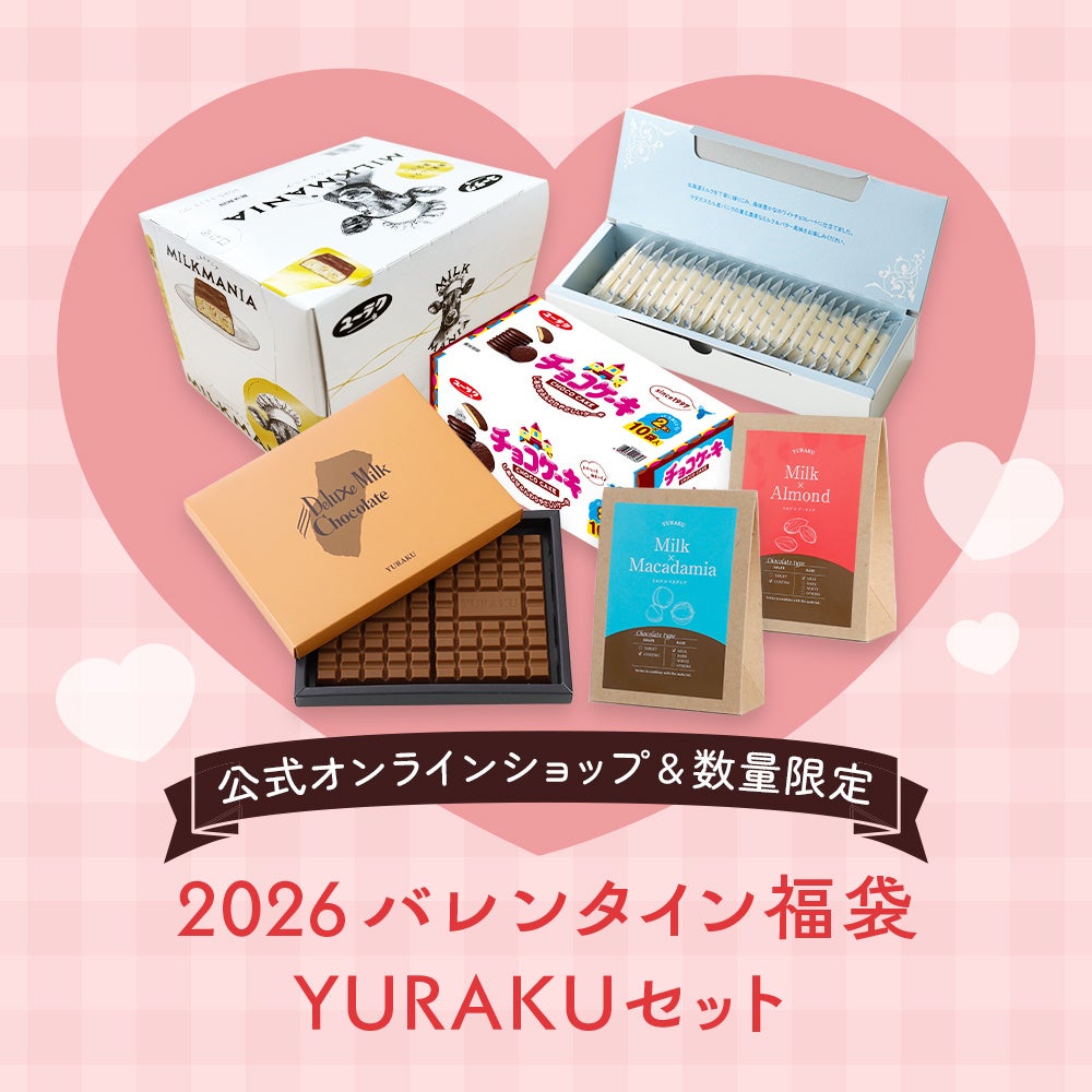 内容:デラックスミルクチョコレート 1箱/デラックスチョコレート 薄板ホワイト 1箱/YURAKUショコラボール ミルク×アーモンド 1箱/YURAKUショコラボール ミルク×マカダミア 1箱/ミルクマニア 1箱/チョコケーキ 1箱/バレンタインポストカード(YURAKU) 1枚