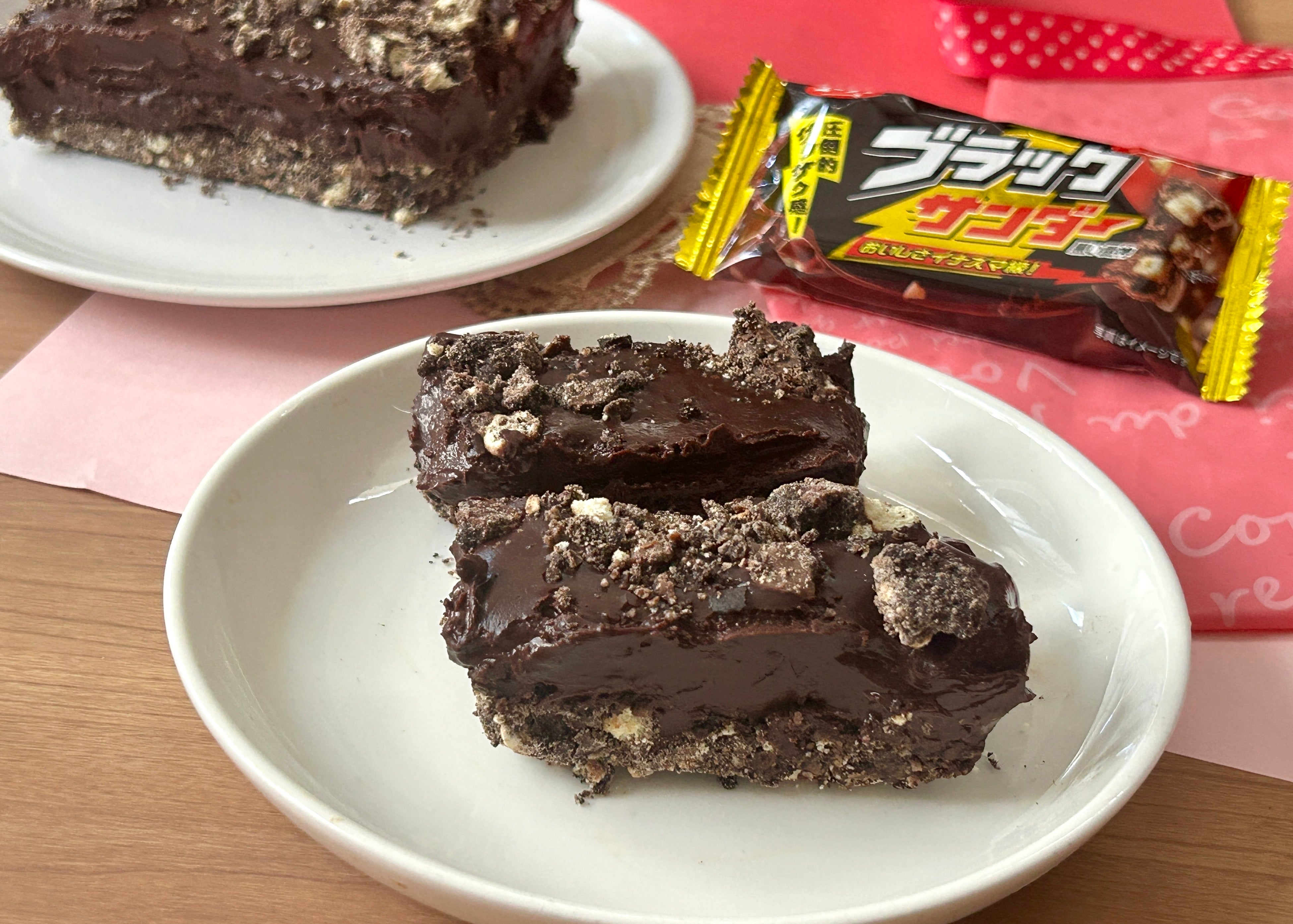 飾り用のブラックサンダーを上にのせて冷蔵庫で冷やし固めたら完成。