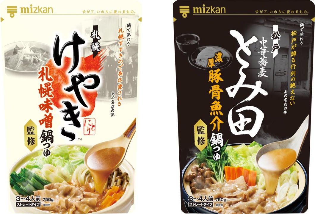 株式会社Mizkan (本社:愛知県半田市、代表取締役社長兼CEO:吉永 智征、以下:ミツカン)は8月2日(水)より「札幌味噌拉麺専門店けやき監修 札幌味噌鍋つゆ」「中華蕎麦とみ田監修 濃厚豚骨魚介鍋つゆ」を新発売いたします。行列の絶えない名店「札幌味噌拉麺専門店けやき」「中華蕎麦とみ田」が監修した、こだわりの鍋つゆです。名店の味を再現した鍋つゆで、ご家庭で、あの名店の味を楽しめます。