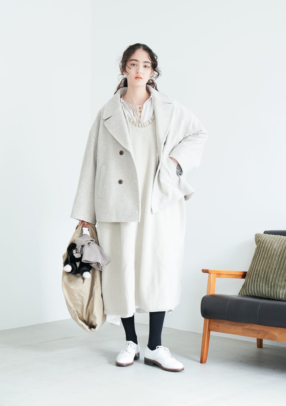 ラウンドカラーとコクーンシルエットでソフトな印象になっております。