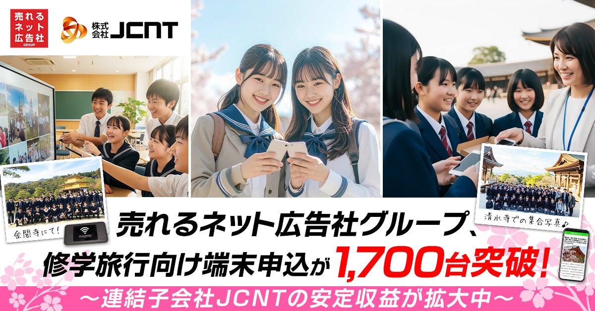売れるネット広告社グループ株式会社(本社:福岡県福岡市、代表取締役社長 CEO:加藤公一レオ、東証グロース市場:証券コード9235、以下 売れるネット広告社グループ)のグローバル情報通信事業・連結子会社である株式会社JCNTは、来年春の修学旅行利用の申込みが1,700台を突破いたしましたことをご報告いたします。これは、2025年9月2日にお知らせいたしました、春プラン申込の開始時期を早めたことで、早期に端末を確保したいというお客様のニーズに対応できている成果と認識しており、当社としても早期に必要台数を確保することでコスト削減を見込め、当社の堅実かつ安定的な成長に寄与するものと考えております。今後も、修学旅行に参加される学生・生徒の皆様の貴重な体験の一助となれるようなサービスを展開してまいる所存です。
