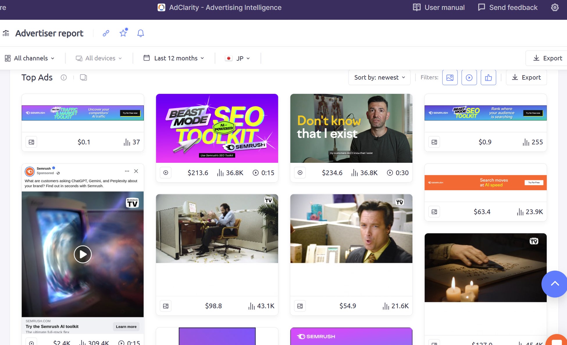 鈴木氏:広告の配信開始にあたり同業他社クリエイティブを分析する必要性があり、そのなかでSemrushのAdClarityという機能を知ったのがきっかけです。社内のニーズに、ディスプレイ、SNS、動画など多くの配信チャネルを多角的に分析できるSemrushが応えてくれました。いくつか他のツールも比較検討しましたが、同じく弊社が探していたSEO機能もSemrushには充実していることを知りました。SEOと広告を併せて利用できるなら、ということで導入に至りました。