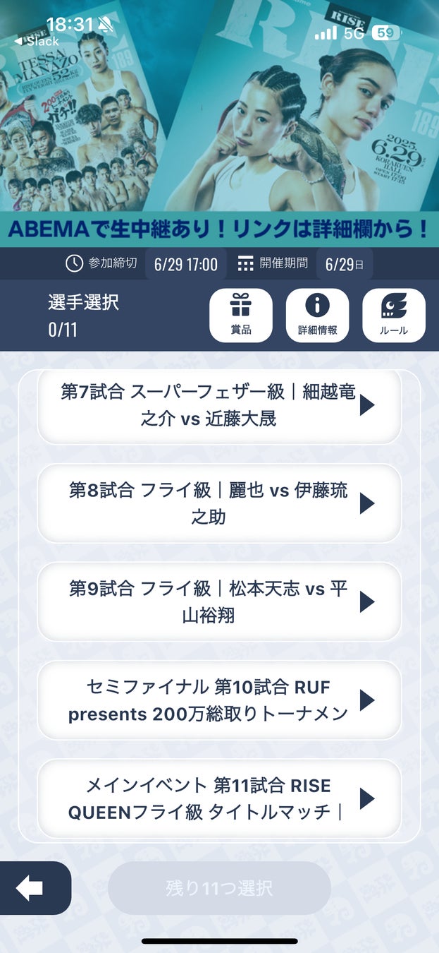 なんドラで開催中の『RISE189』勝敗予想企画。