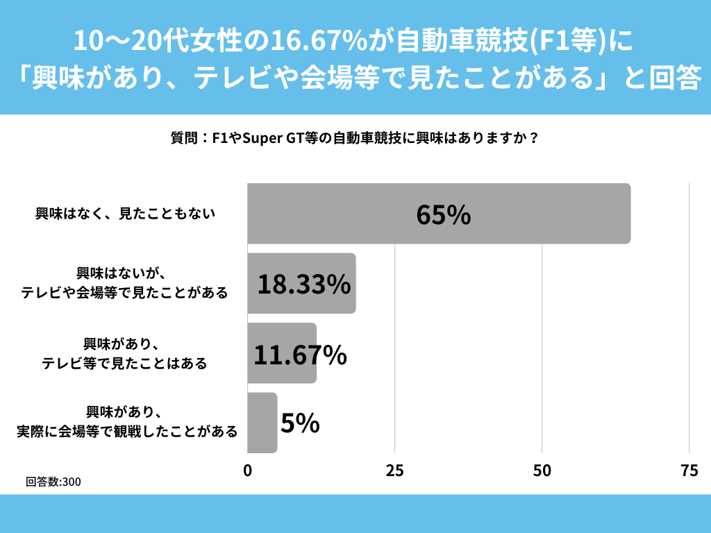 10~20代女性を対象とした「F1やSuper GT等の自動車競技に興味はありますか?」というアンケートで最も多かった回答は「興味はなく、見たこともない」で65%でした。