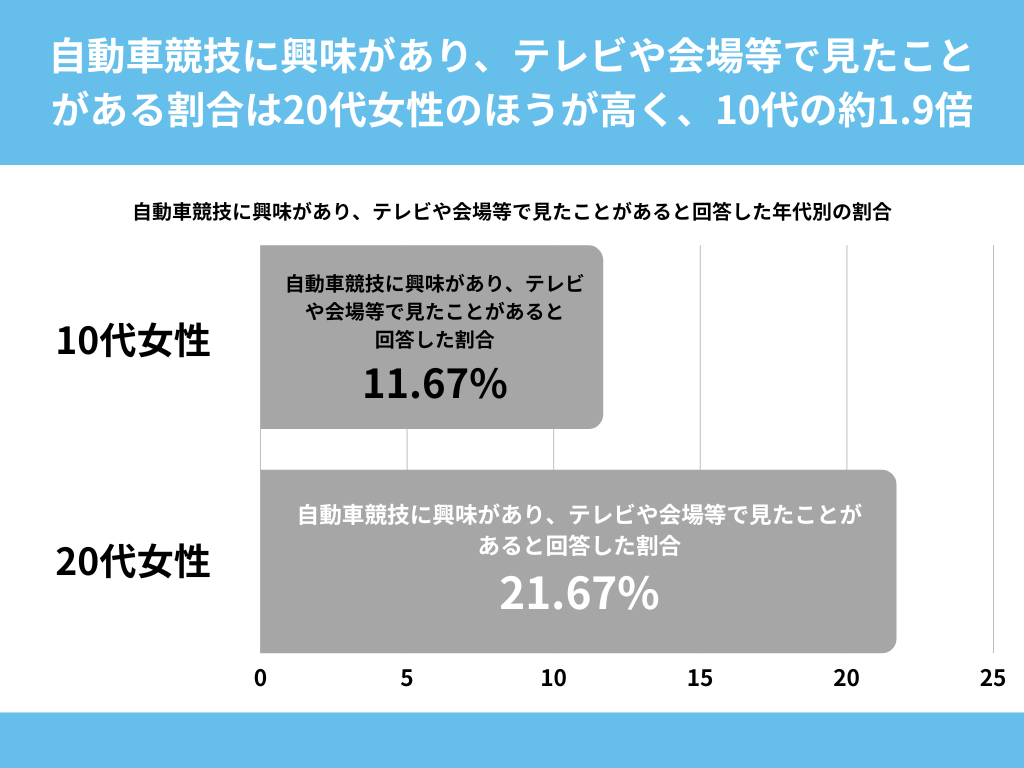 【自動車競技に興味があり、テレビや会場等で見たことがある割合は20代女性のほうが高く、10代の約1.9倍】