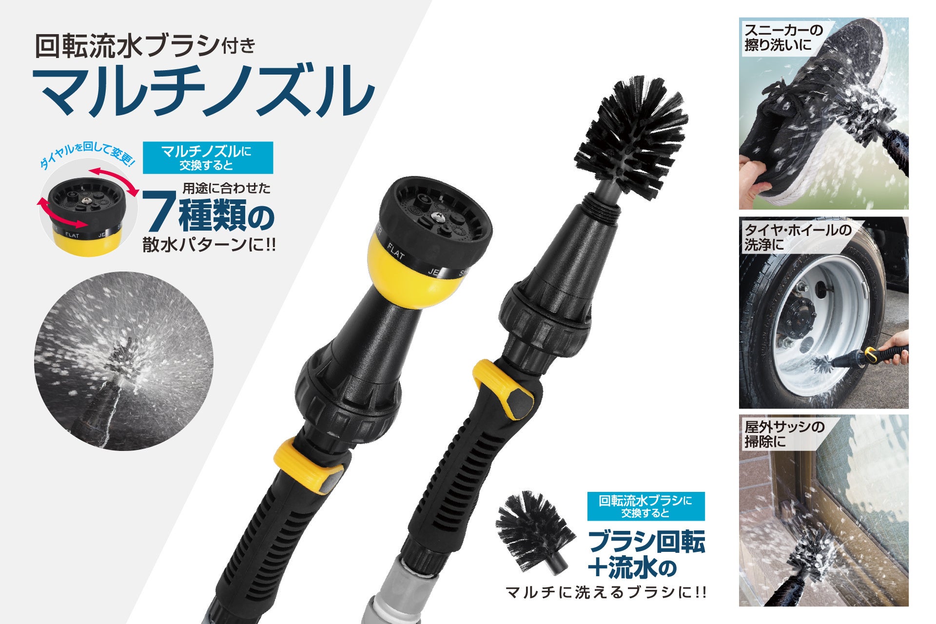 特徴:ブラシ回転と流水でしっかり洗えるマルチなブラシと7種類の散水パターンに切り替え可能なマルチノズルの2WAY仕様。ガーデニングや掃除にとっても便利!電源不要でホースに取り付けて準備OK!無段階調節可能な水量調節スイッチ付き。用途に合わせてマルチに使えます!