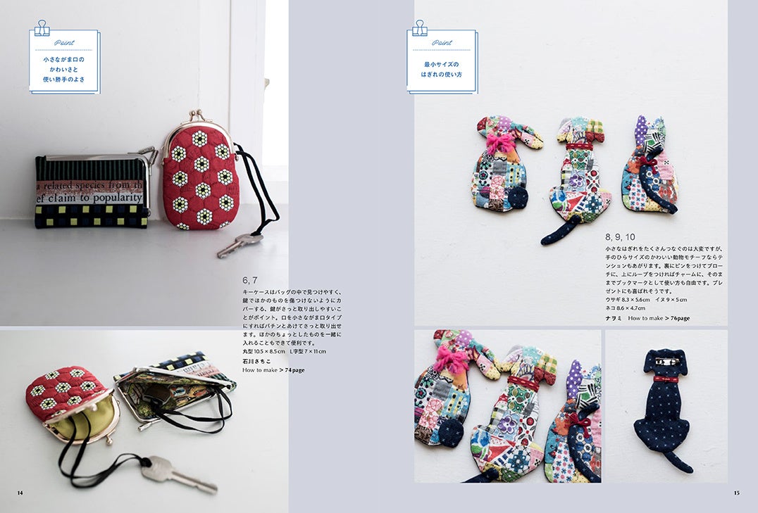 何種類かの小さなはぎれを縫い合わせて本体にしたり、デザインのポイントとして使ったり。小さながま口や、最小のはぎれを組み合わせたカラフルな布ブローチなど、作品作りのアイデアがいっぱいです。