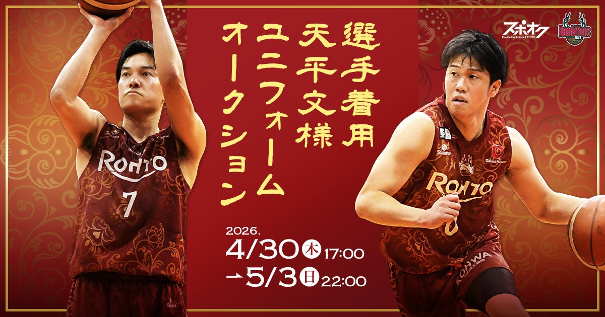 株式会社モバオク(本社:東京都渋谷区、代表取締役社長:小一原 宏樹、以下モバオク)がエンゲート株式会社(本社:東京都中央区、代表取締役:城⼾ 幸⼀郎、以下エンゲート)と業務提携し提供するスポーツチーム公式オークションサービス「スポオク」にて、B.LEAGUE所属のバンビシャス奈良が実施する『バンビシャス奈良 選手着用 天平文様ユニフォームオークション』が2026年4月30日(木)から開始されます。