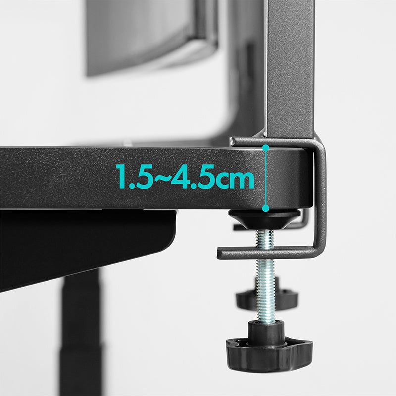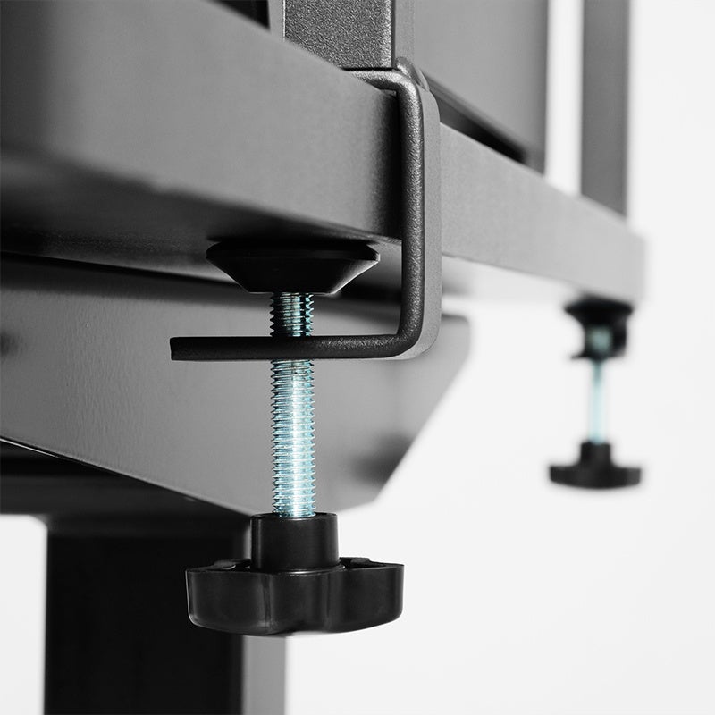 デスクへの取り付けは、3箇所のクランプでしっかりと固定可能。デスクに穴を開けずに、好きな場所へ移動・固定ができます。※天板裏に4cm以上の余白が必要