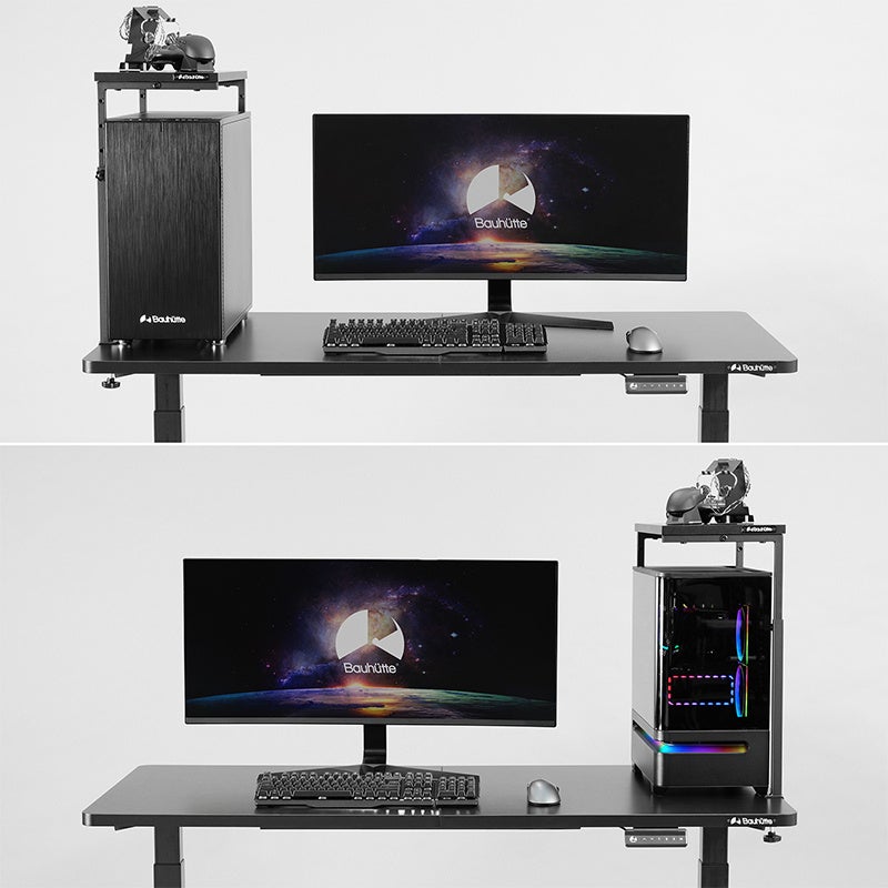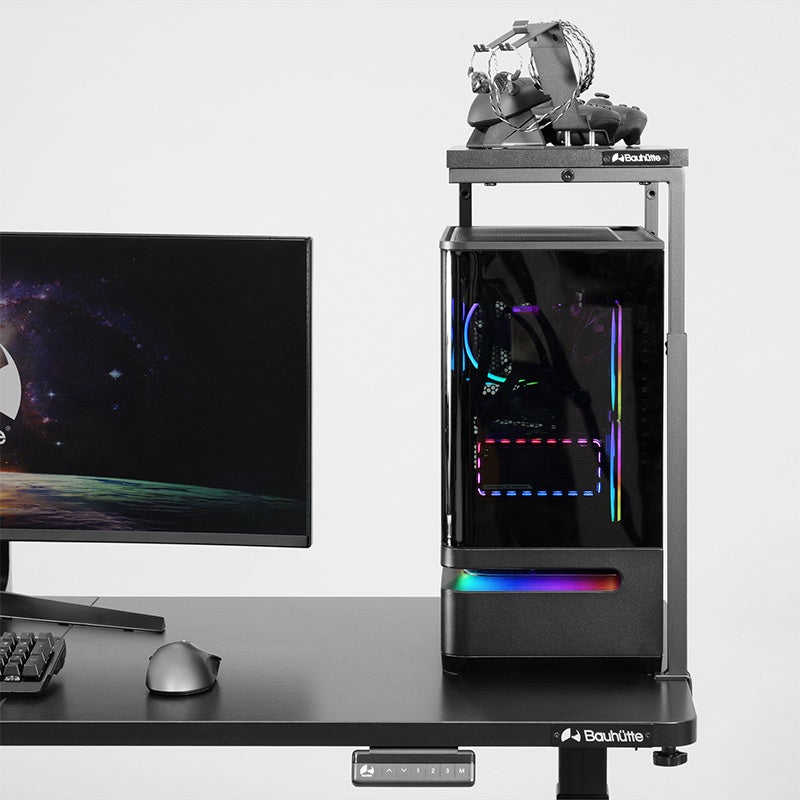 前面の支柱を排除した独自の3本足デザインを採用。こだわりのライティングや内部パーツの輝きを遮りません。耐荷重15kgのタフな仕様で、大型PCに占拠されたデスク面積を垂直方向に拡張し、新たな天板スペースを増築可能です。手前の足がないため、幅や奥行のある筐体にも柔軟に対応します。