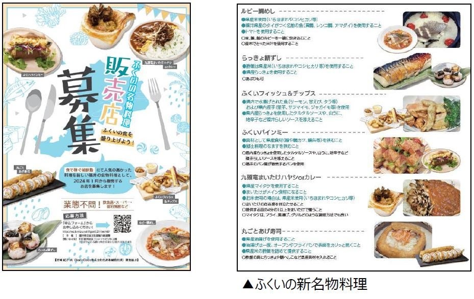 この企画は、福井県が県内飲食店等と協力し、ふくいの新名物料理として開発した「ルビー鯛めし」や「らっきょ鯖寿司」、「ふくいフィッシュ&チップス」などのメニューを県内の飲食店や小売店がオリジナルメニューとして創作・販売するものです。