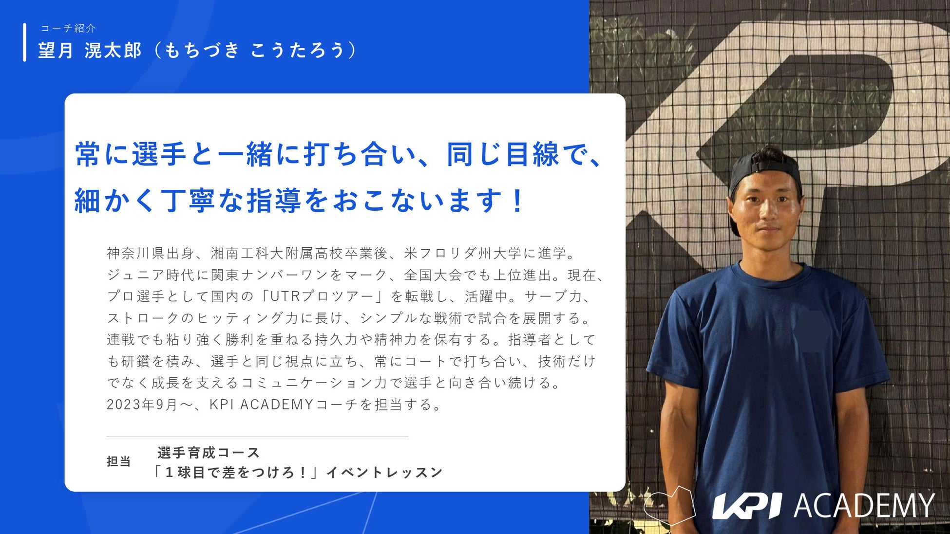 KPI株式会社(本社:東京都渋谷区、代表取締役CEO:薮田 恵士)が運営する、世界に通用するプロのテニス選手育成を目的としたテニスアカデミー「KPI ACADEMY」では、2025年7月5日に「1球目で差をつけろ!望月滉太郎プロとのサーブ&リターン練習【小学4~6年生男女】」を開催しました。