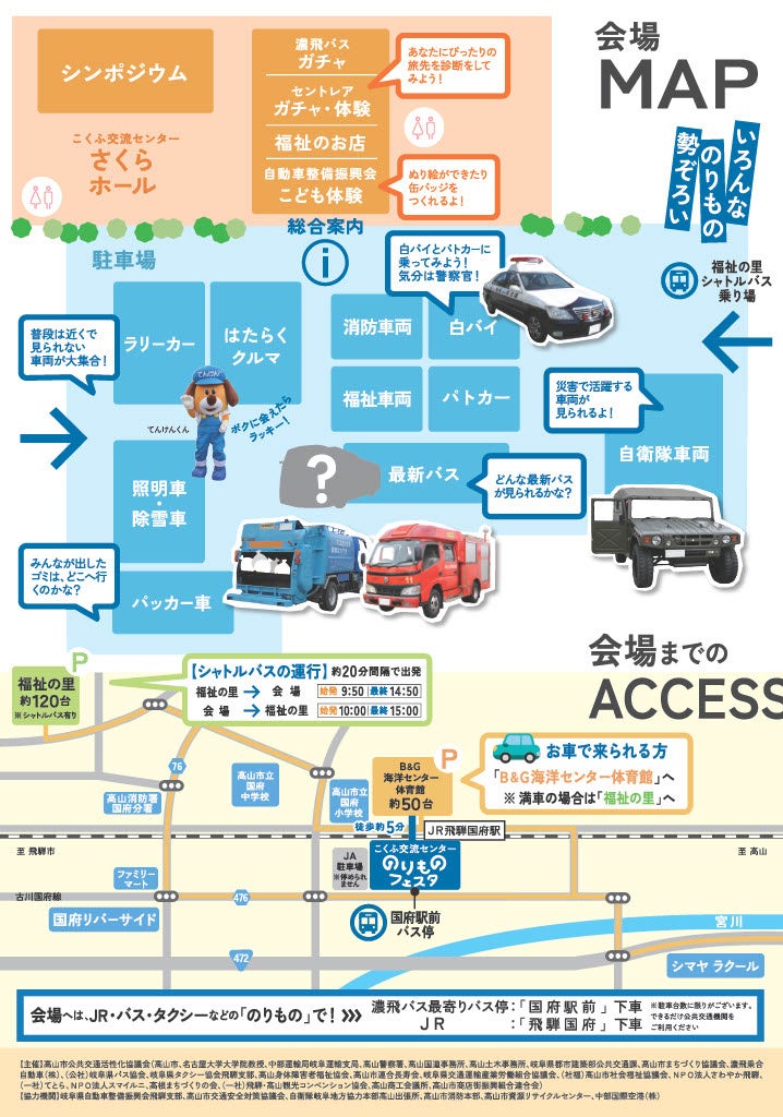 高山市は全国最大の市域面積(約2,177km²)を持ち、山間部を含む広大なエリアをカバーする公共交通ネットワークの維持が重要な課題となっています。本イベントを通じて、日ごろ利用しているバスやのりものへの理解を深め、公共交通の未来について一緒に考える機会を提供します。