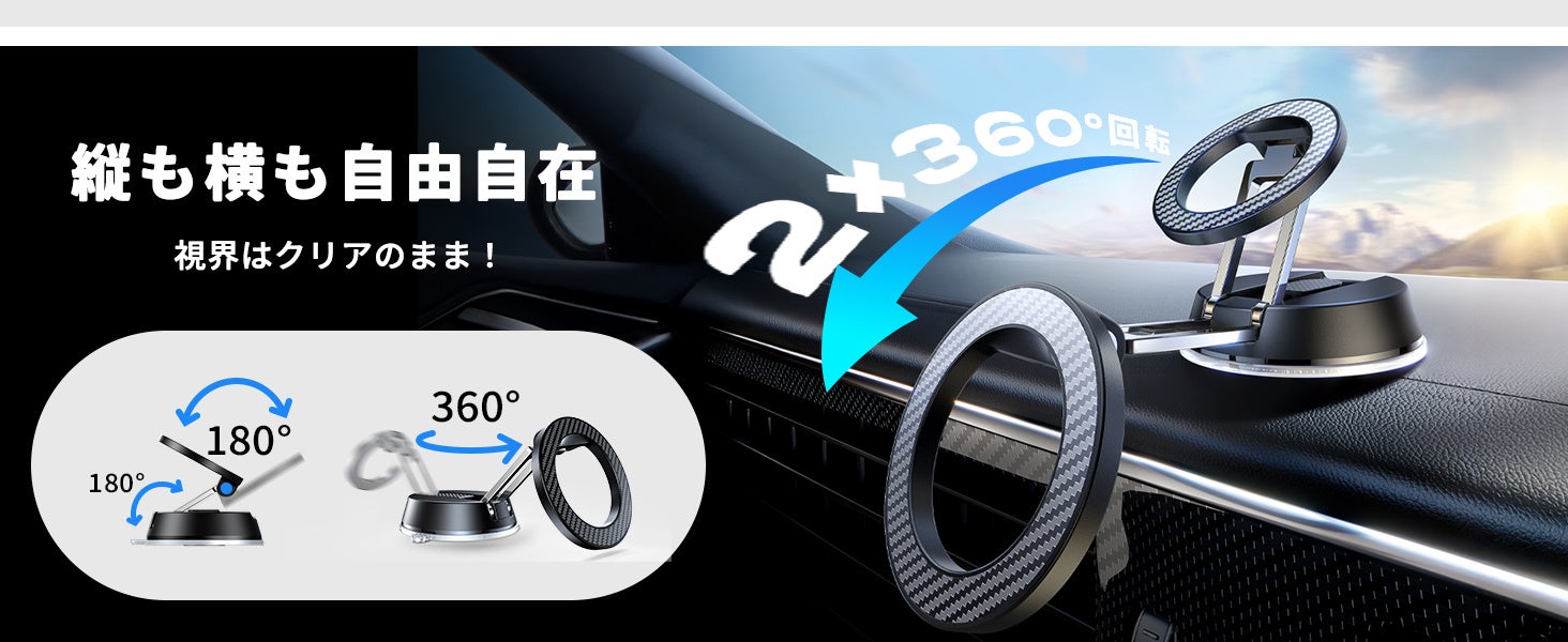 ホルダーは270°+180°の広域可動域を備え、片手で素早く縦横切替が可能。運転席からの視野を最適化し、安全運転をサポートします。