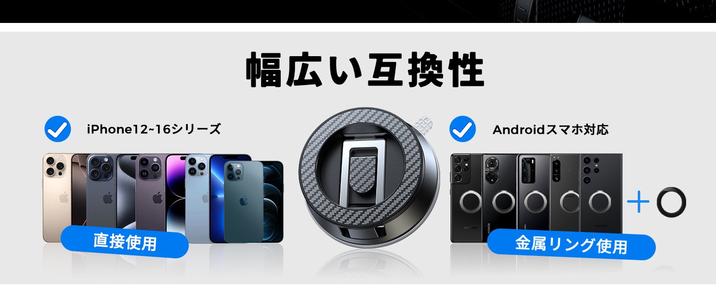 iPhone 12以降のMagSafeシリーズはもちろん、Android各機種(Galaxy、Xperia、Pixelなど)にも対応。金属リングを装着すれば、ほぼ全てのスマートフォンで利用できます。