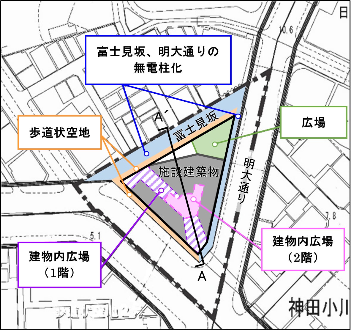 当地区は高低差があるだけでなく、電柱が歩道空間の障害となっており景観を阻害している状況です。本プロジェクトでは、敷地内に歩道状空地を設け、歴史ある富士見坂をシンボルロードとして整備するとともに明大通りを含めて無電柱化を図り、地区内のバリアフリー化を推進します。また、まち歩きの起点、中継点となるような広場を整備し、来街者や地域の人々が憩える、安全で快適な歩行者空間を創出します。