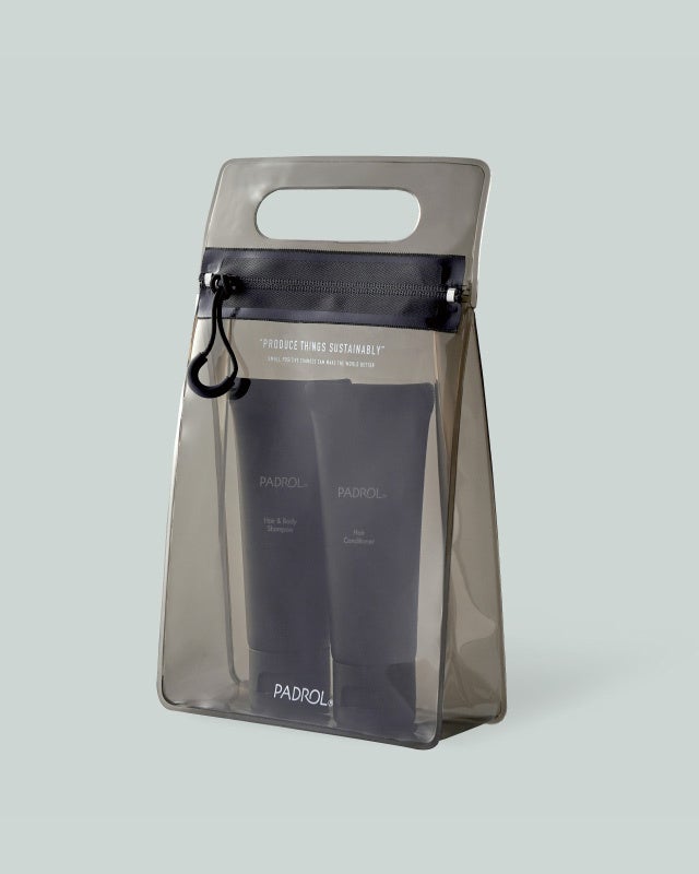 水気の多い場所での使用を想定した耐水仕様*の専用ポーチに入ったトラベルセット。
