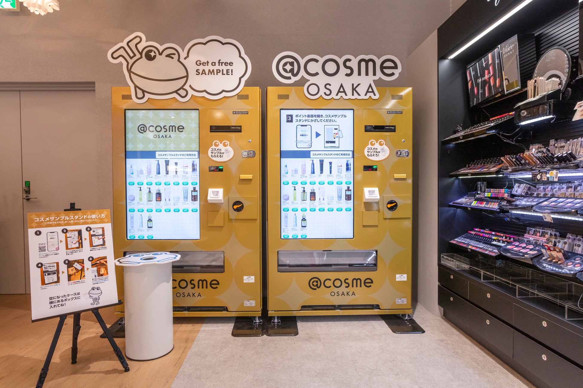 @cosmeのアプリをかざすと、お一人様1日1回、好きなサンプルが無償でもらえる自動販売機を初導入いたしました。グランドオープンに際しては、19ブランドのサンプルがそろいます。