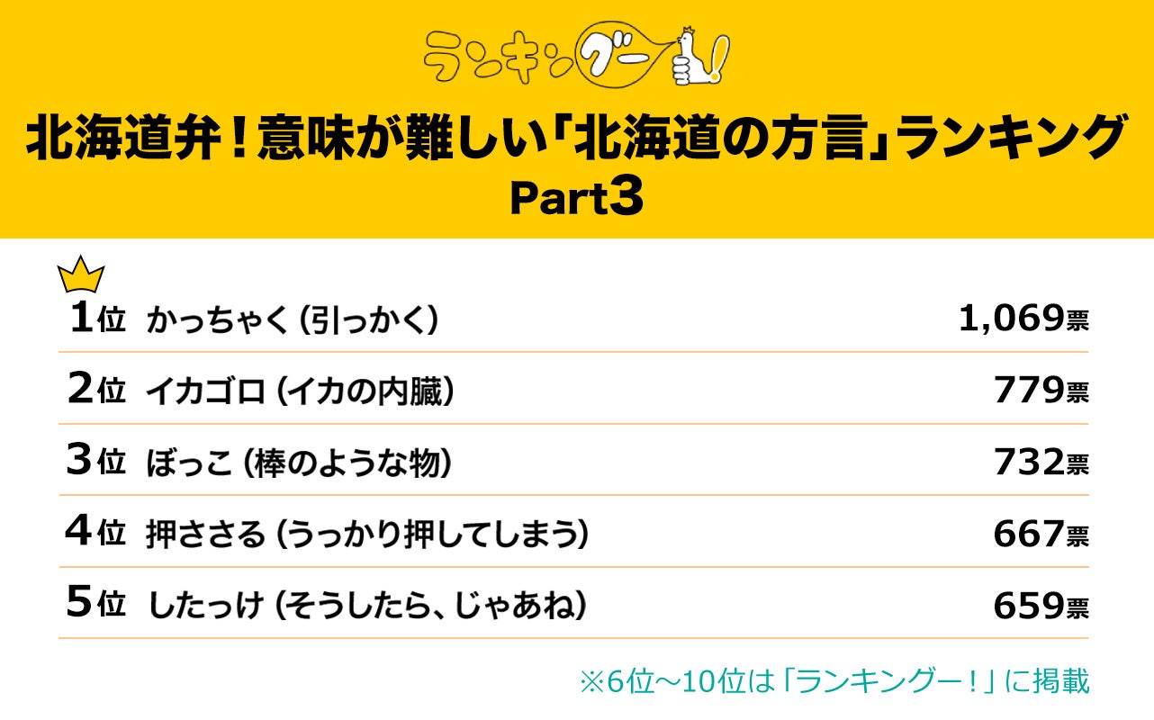 株式会社CMサイト(本社:大阪府大阪市、代表取締役社長:柴原 誠治)が企画編集する、「ちょっと気になる」を調べたランキングサイト『ランキングー!(https://rankingoo.net/)』は、『北海道弁!意味が難しい「北海道の方言」ランキングPart3』の結果を、投票者のコメント付きで紹介する記事として公開しました。