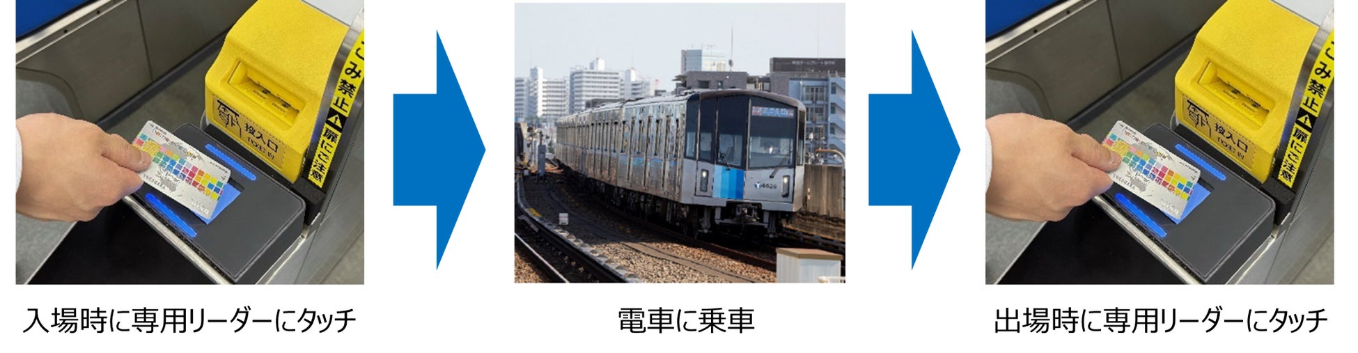 クレジットカードやデビットカード等のタッチ決済による乗車では、ICカードへのチャージやきっぷの購入が不要となり、お客様がお持ちのタッチ決済対応のカード(クレジット・デビット・プリペイド)や同カードが設定されたスマートフォン等を、自動改札機に新たに設置する専用リーダーにタッチすることで改札を通過できます。