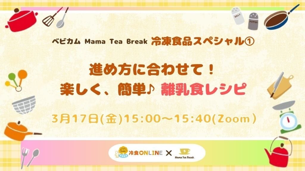 この番組は、ベビカムが定期的に開催しているママ(パパ)向けオンライン番組「ママティーブレイク」の特別版です。今回は、「冷食スペシャル① 〜進め方に合わせて!楽しく、簡単♪ 離乳食レシピ〜」と題して、(一社)日本冷凍食品協会(https://www.reishokukyo.or.jp/)とコラボでお届け。