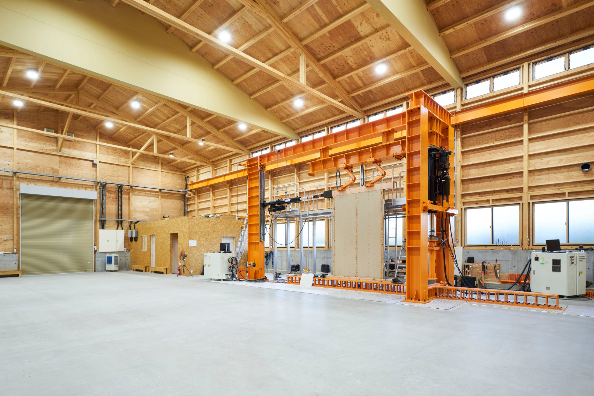 2024年6月から稼働した「構造実験棟」は、住宅用一般流通材を使用。最小限の部材で構成された合理的な木造トラス(AQトラス:意匠権出願中)により、512㎡の無柱大空間を実現させました。木造平屋建てで大空間の構造実験棟には「水平加力試験」と「鉛直加力試験」の複合機が設置されており、面内せん断試験や曲げ試験、軸圧縮試験などを行うことが可能です。中大規模木造建築の開発専用最大荷重500kNの水平加力試験機は、公開施設としては日本初※となります。