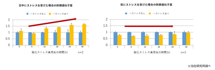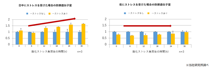 人の身体には、時計のように約24時間の周期的なリズムを刻む遺伝子があり、肌状態も時刻によって変化します。しかし、肌が酸化ストレスなどのダメージを受けると、遺伝子のリズムも乱れます。酸化ストレスと遺伝子の研究を進める弊社は、活性酸素の防御遺伝子について研究したところ、日中に酸化ストレスを受けるよりも夜に受けた方が、防御遺伝子は回復しづらく、エイジングを引き起こしやすい状態になっていることを新たに発見。さらに、肌の弾力に関わるコラーゲン産生遺伝子についても、同様に日中よりも夜に酸化ストレスを受けた方が、遺伝子の回復が遅くなることを発見しました。