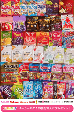 GUMMIT:日本グミ協会とグミ・キャンディーを扱う、春日井製菓株式会社(本社:愛知県名古屋市、代表取締役社長:春日井 大介)、カバヤ食品株式会社(本社:岡山市北区、代表取締役社長:野津 基弘)、カンロ株式会社(本社:東京都新宿区、代表取締役社長:村田 哲也)、ニッポンエール(全国農業協同組合連合会(本所:東京都千代田区、代表理事理事長:野口 栄)の商標登録ブランド) 、ハリボージャパン株式会社(本社:東京都港区、日本法人代表:下出 香織)、UHA味覚糖株式会社(本社:大阪市中央区、代表取締役社長:山田 泰正)、の複数の企業・ブランドからなる「グミのサミット」。